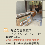 2021年7月20日 / 最終更新日時 : 2022年5月29日 kokoplus 営業のお知らせ 【今週の営業のご案内】(7/20〜7/26) 7/20(火) 11:00~19:007/21(水) 11:00~19:00 ※一部コーナーにて菓子製造業でできること初心者向けプライベート実務講座実施7/22(木) 11:00~19:00※午後より菓子販売※一部コーナ […]