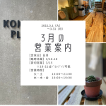 2022年3月1日 / 最終更新日時 : 2022年3月22日 kokoplus 営業のお知らせ 【3月の営業のお知らせ】 【コワーキングカフェ営業案内】 ※ドロップインでご利用いただける日時です コワーキングでのドロップイン利用及びお買い物のお客様は、3月は下記の日程にて営業しております。 どうぞよろしくお願い申し上げます。 【営業時間】 […]