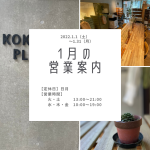 2021年11月30日 / 最終更新日時 : 2022年1月11日 kokoplus 営業のお知らせ 【12月の営業のお知らせ】 12月の営業のお知らせです。 【コワーキング(時間制)カフェ営業案内】 【営業時間】11時から19時 【定休日】 日月 【年末年始休業】 12/26(日)~1/10(月) ※大変長期間お休みとなりますがよろしくお願 […]