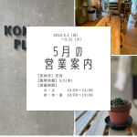 2022年4月27日 / 最終更新日時 : 2022年4月28日 kokoplus 営業のお知らせ 【5月の営業のお知らせ】 【コワーキングカフェ営業案内】 ※ドロップインでご利用いただける日時です 5月の「個々の作業時間」(コワーキングカフェ)のご案内です。 ドロップインでのご利用 及びお買い物でご利用のお客様、 お待ち申し上げております。 […]