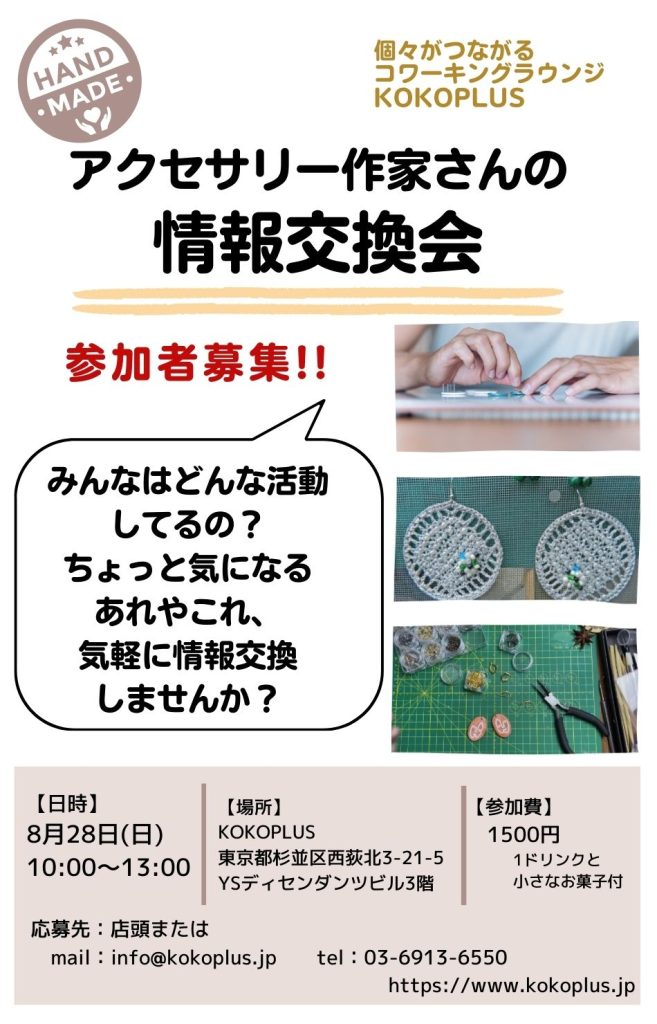 リクエストにより、今月8/28(日)にアクセサリー作家さんの情報交換会を開催することとなりました。