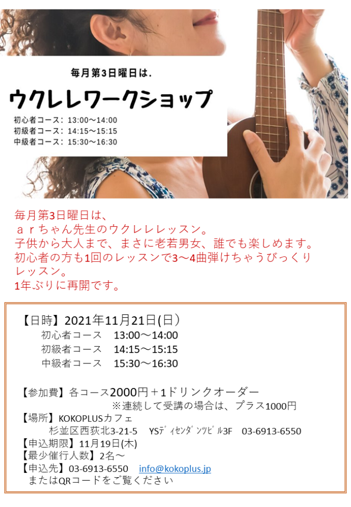 11/21(日) ウクレレ教室【募集中】 詳細はこちらから 今回初心者コースは満席です。