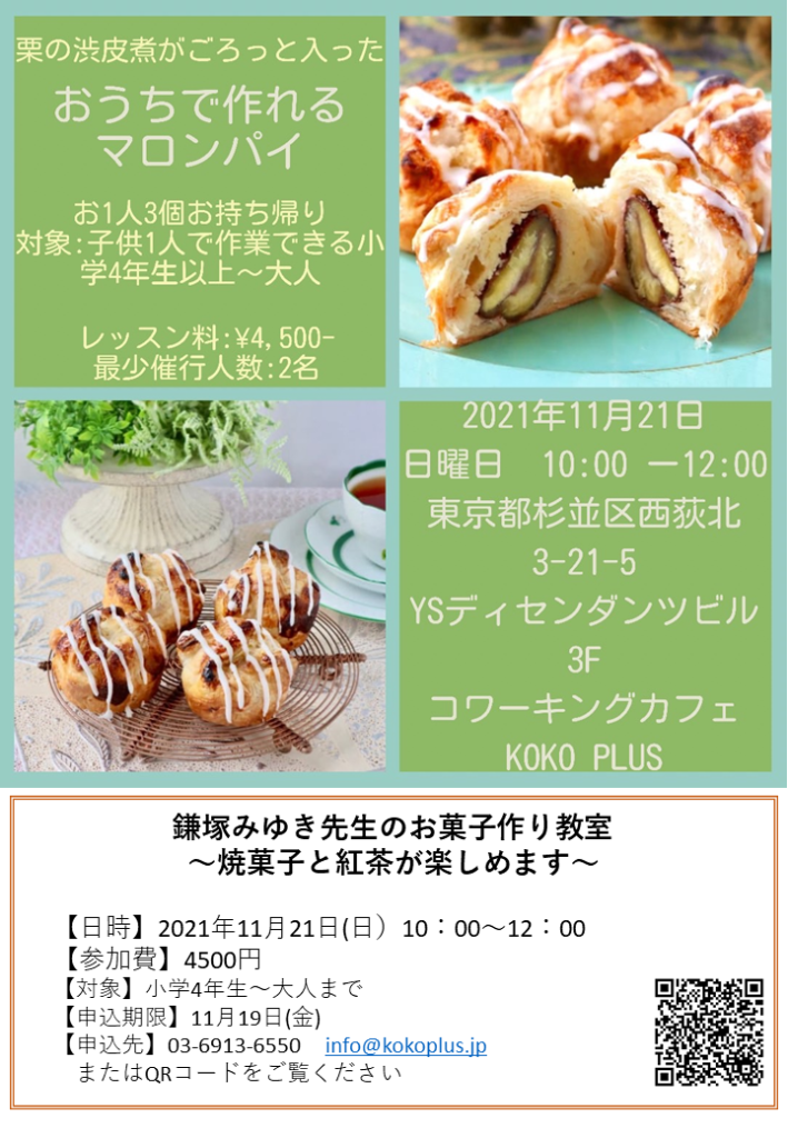 11/21(日) マロンパイの焼菓子教室【募集中】 お子様も参加できます